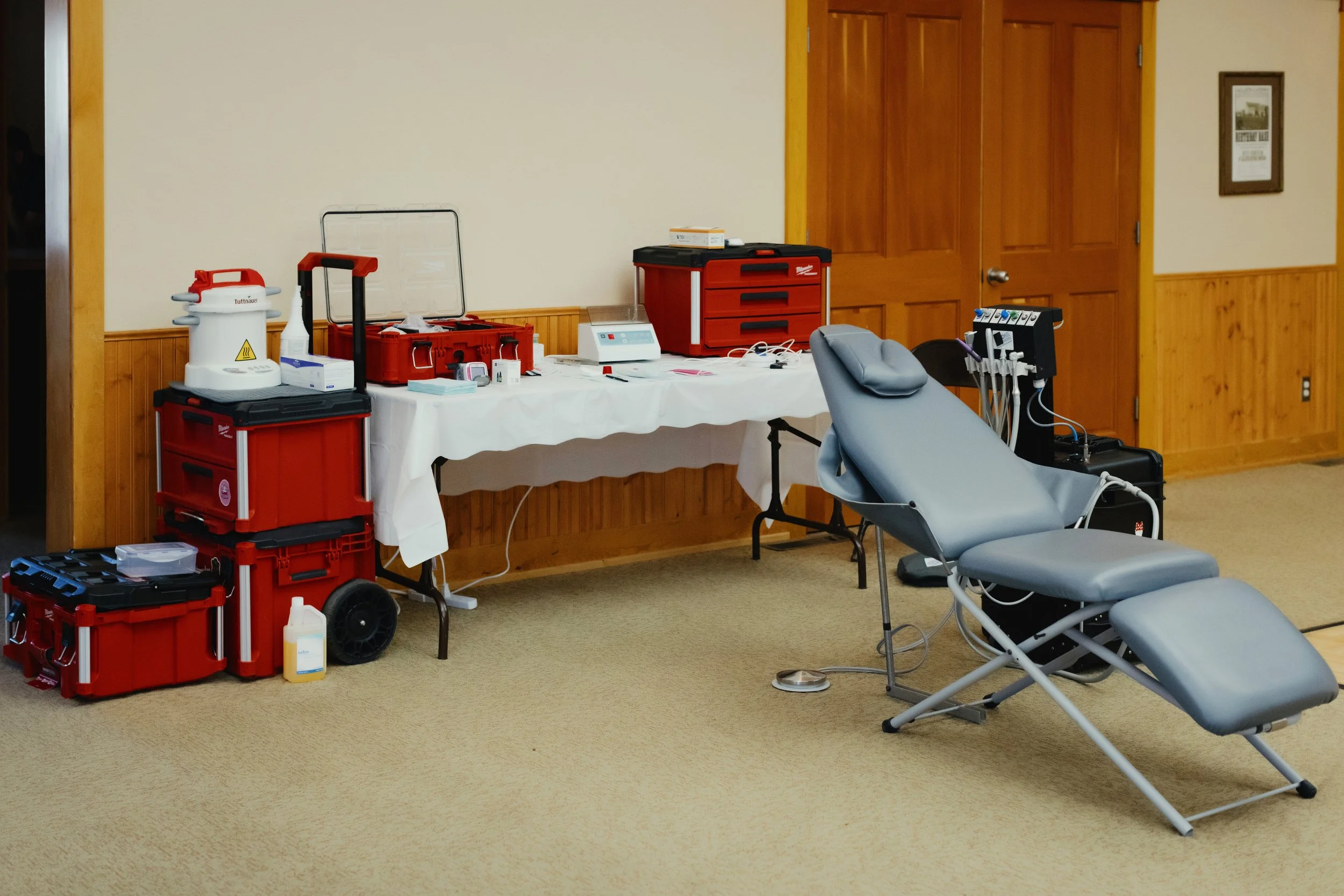 At the heart of this system are our Milwaukee Packout cases, DNTLWorks portable dental units, and patient and provider chairs. Together, these components allow us to fully set up a functioning dental clinic in virtually any space and begin treating patients the same day.